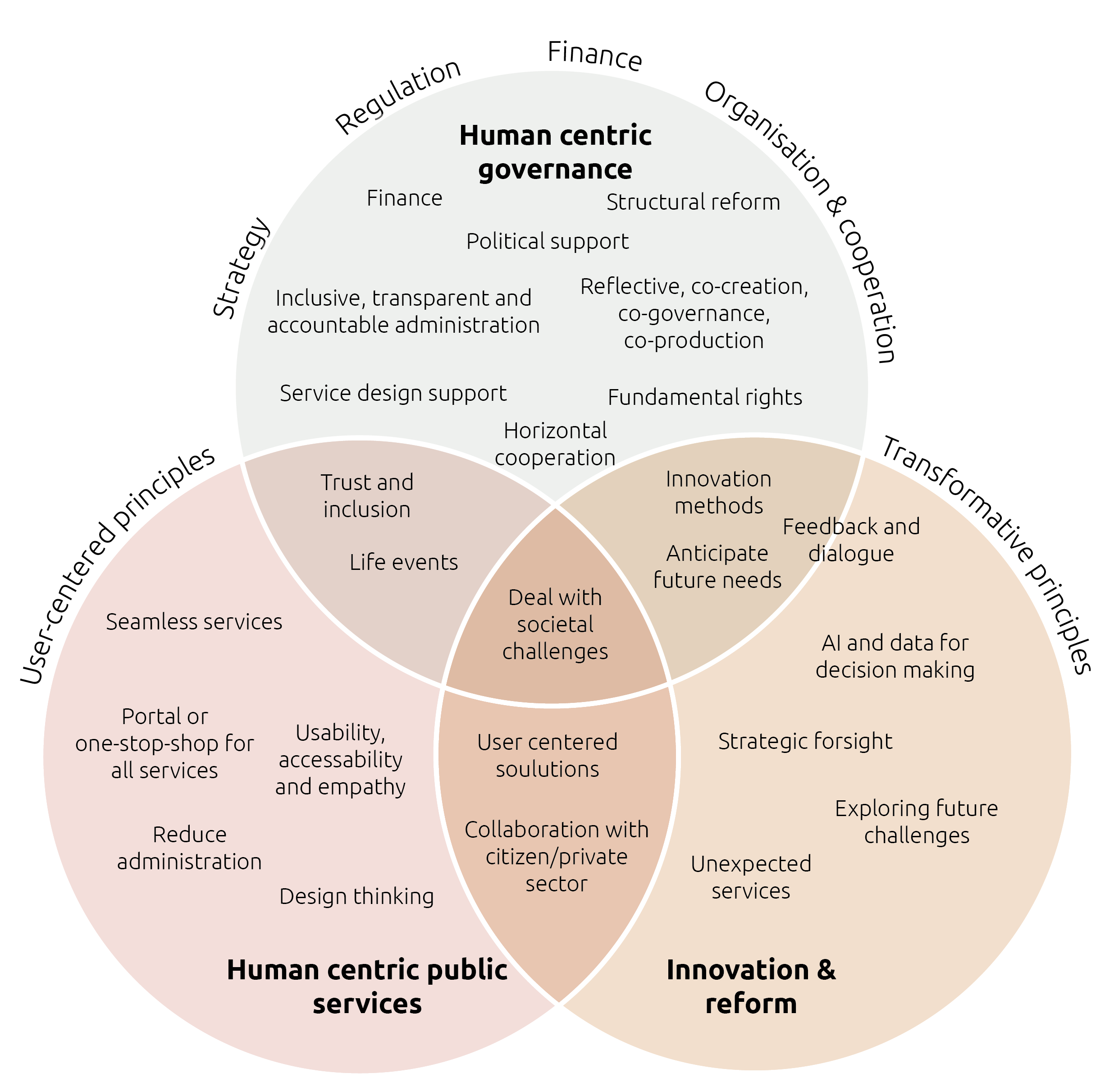 Figure 1 Three dimensions of human-centredness: governance, services, and innovation, all working together to put people at the center.