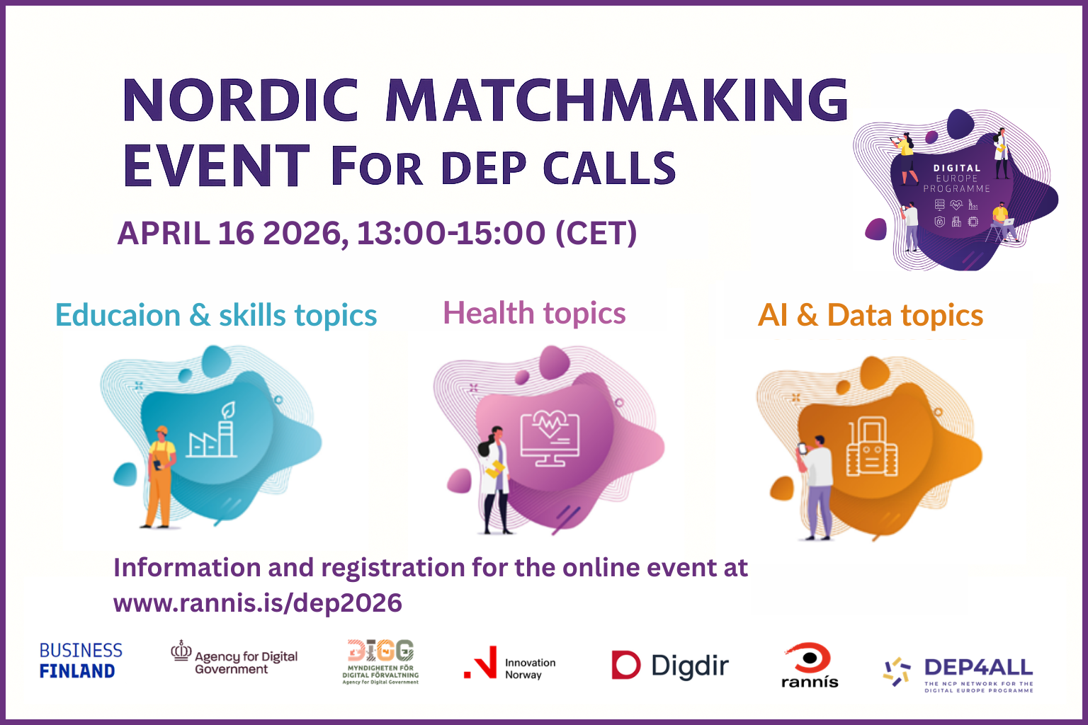 Delta i ett nordiskt digitalt informations- och matchmakingmöte om kommande utlysningar inom DIGITAL-programmet. Mötet ger dig möjlighet att få en överblick över nya utlysningar och knyta kontakter med potentiella samarbetspartner i Norden.