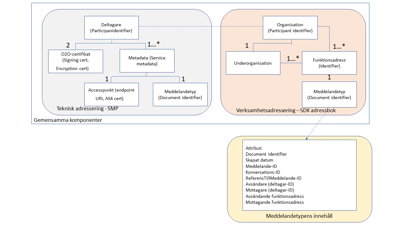 - En metadatatjänst (SMP) som innehåller tekniska uppgifter om var de olika tjänsterna för meddelandeutbyte finns (teknisk ändpunkt för leverans av meddelande), vad de tekniskt stödjer (meddelandeformat, version etc), samt vilka certifikat som mottagande accesspunkt använder.