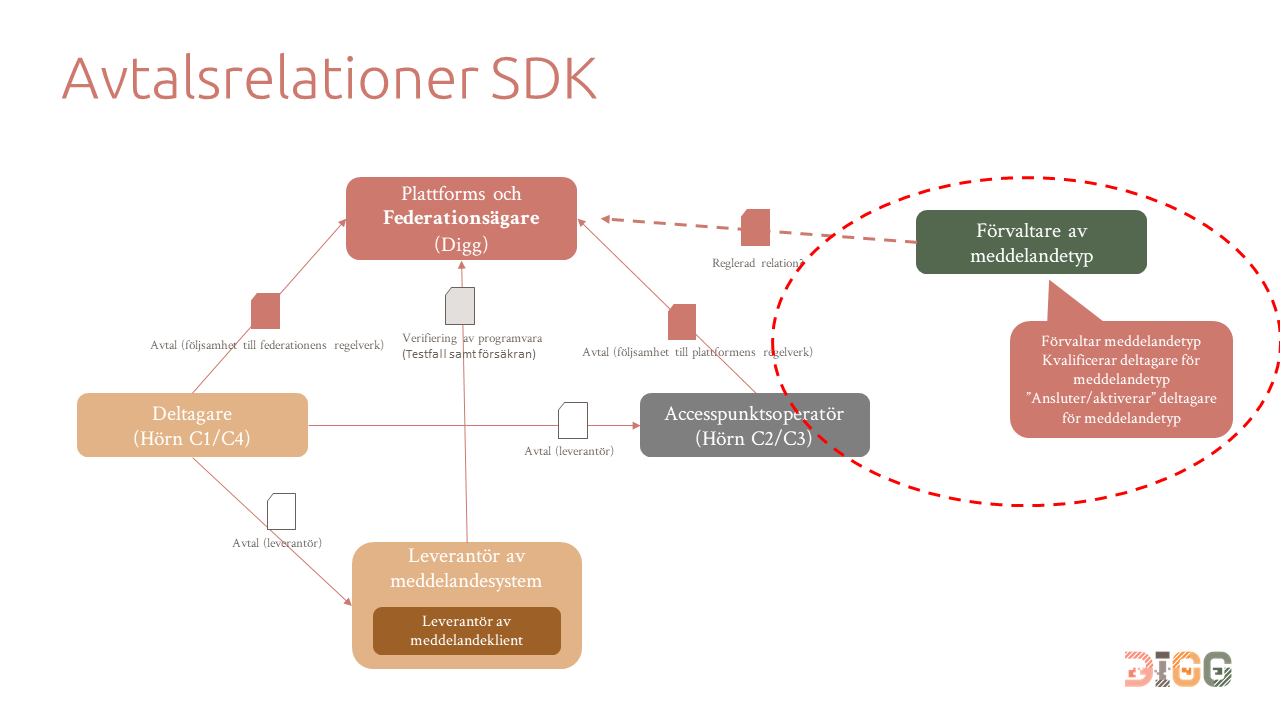 Federation/federationsoperatör (SDK) | Federationsoperatör ansvarar för kundkännedom och godkänner deltagarorganisationens anslutning till federationen. Avtal, regelverk, ramverk och tekniska specifikationer